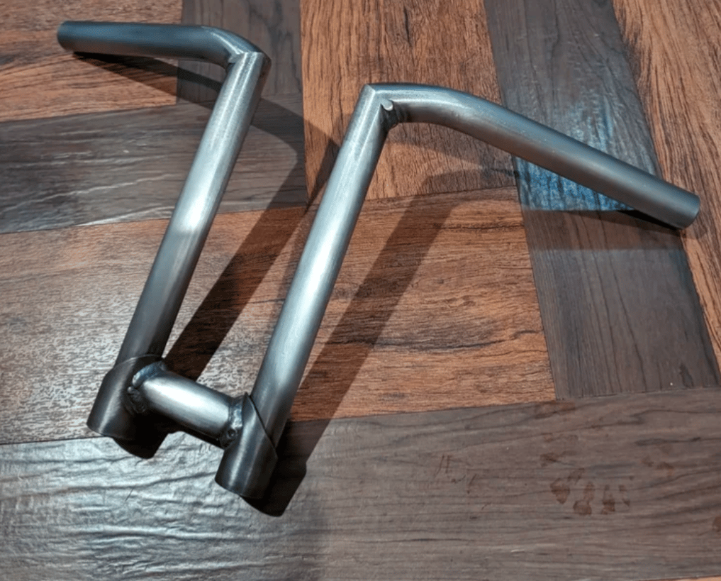 Is handlebar is made using 1-in diameter, mild steel tubing, these handlebars are 12 in tall and have slash style sleeving at the base with a round tube strut for strength. There is 2 in of pullback and very little pull down.