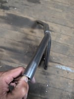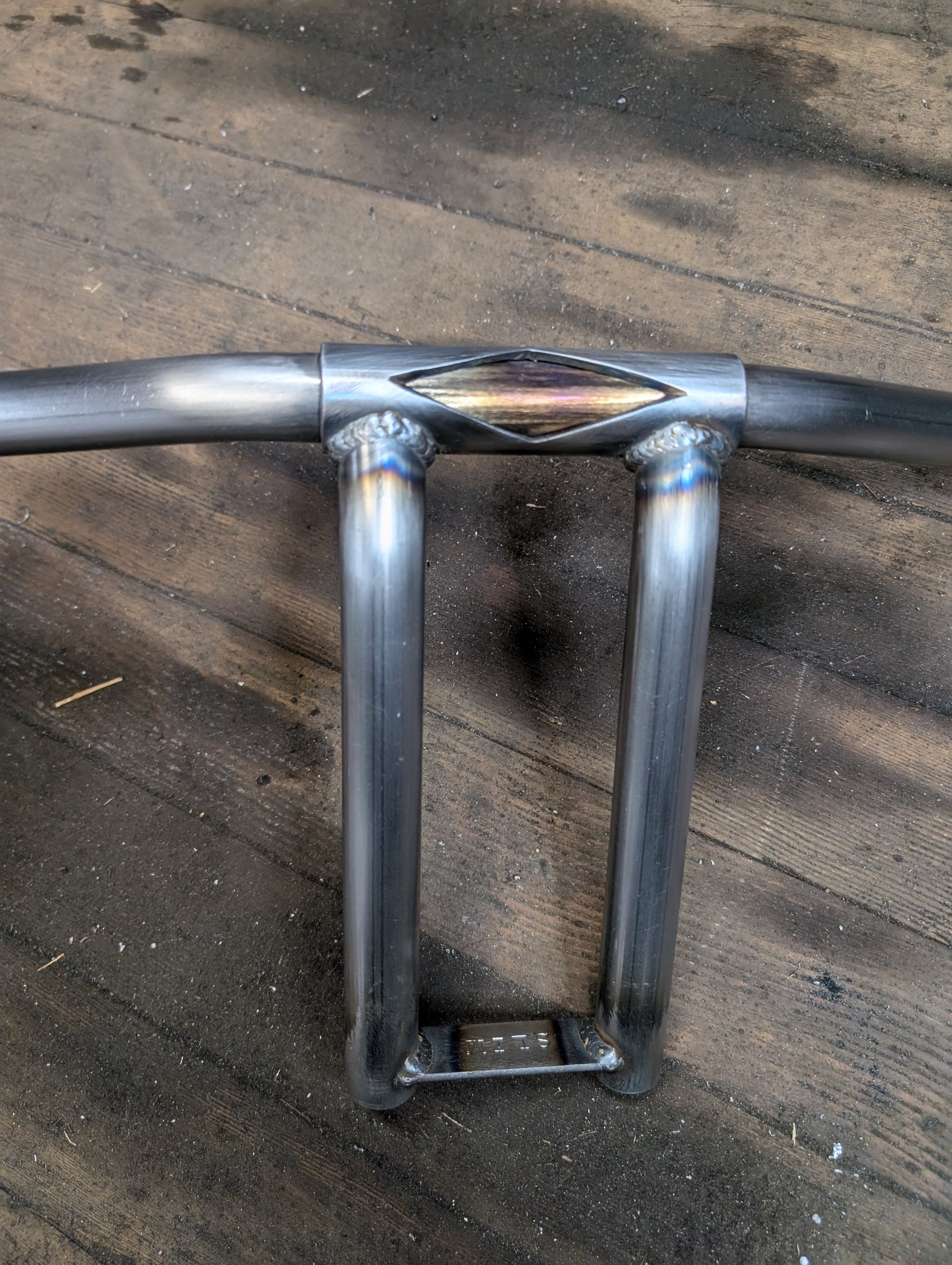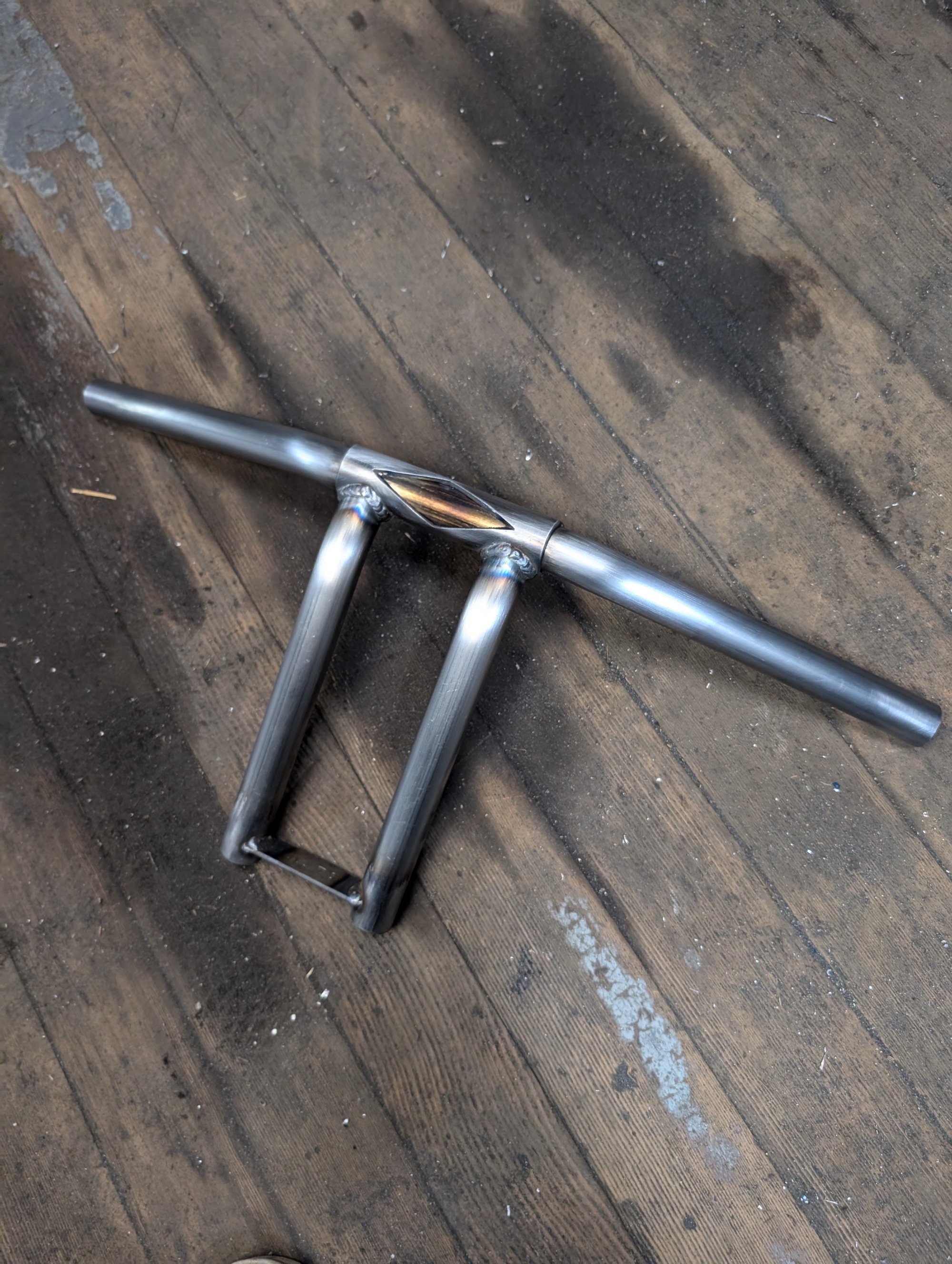 These T- bars are 10 in tall. Made with 1-in mild steel. They have a half inch sweep back in the top of each riser and 2 in pull back in the bars. The special feature on these bars is the sleeve t-point, there's a neatly cut diamond out of the center of it, measuring 2 and 1/2 in wide. There's also a stamped strut running across the bottom for strength . These will fit most H-D trees.